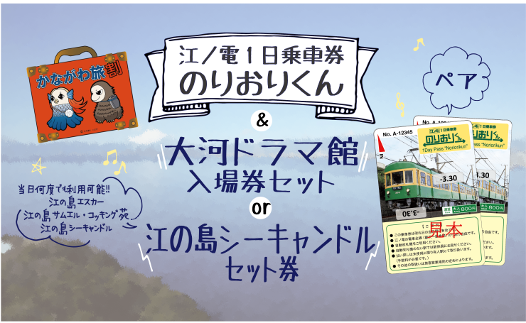 PR TIMESにかながわ旅割 期間限定発売!江ノ電1日乗車券「のりおりくん」&「①大河ドラマ館入場券セット券(ペア券)」または「②江の島シーキャンドルセット券(ペア券)」の発売についてという記事が掲載されていました。