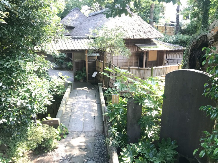 俳諧道場としても有名で、京都の落柿舎、滋賀の無名庵と並び、日本三大俳諧道場のひとつとも言われて名高い場所で、緑が生い茂った中に茅葺き屋根の建物が佇んでいます。