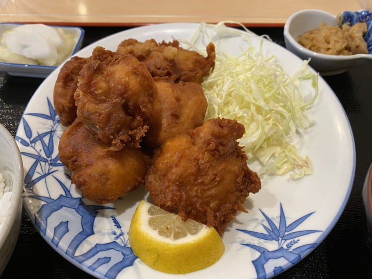 熱々のからあげは、サイズが大きくてサクサクとした薄い衣。しっかりと下味が付いて、ジューシーで歯がなくてもいいくらいの柔らかさです。時折レモンを絞って、さっぱりといただいても。