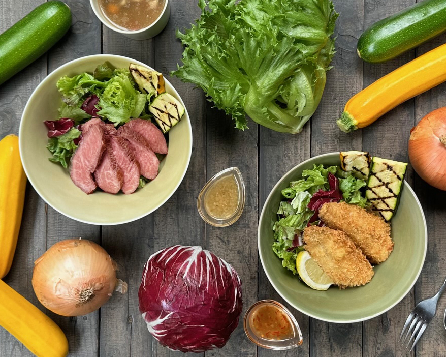 箱根口ガレージ報徳広場内にある「きんじろうCAFE&GRILL」では、2023年8月31日(木)まで小田原漁港で水揚げされた新鮮なアジや地場野菜を使用したヘルシーな「きんじろうドン」2種を提供する。 小田原漁港で水揚げされた新鮮なアジフライを特製スイートチリソースで楽しむ「オダワラアジフライ」(税込1,430円)と、国産牛を低温調理し焼き上げた「ステーキとジバやさい」(税込1,540円)の2種。ご...