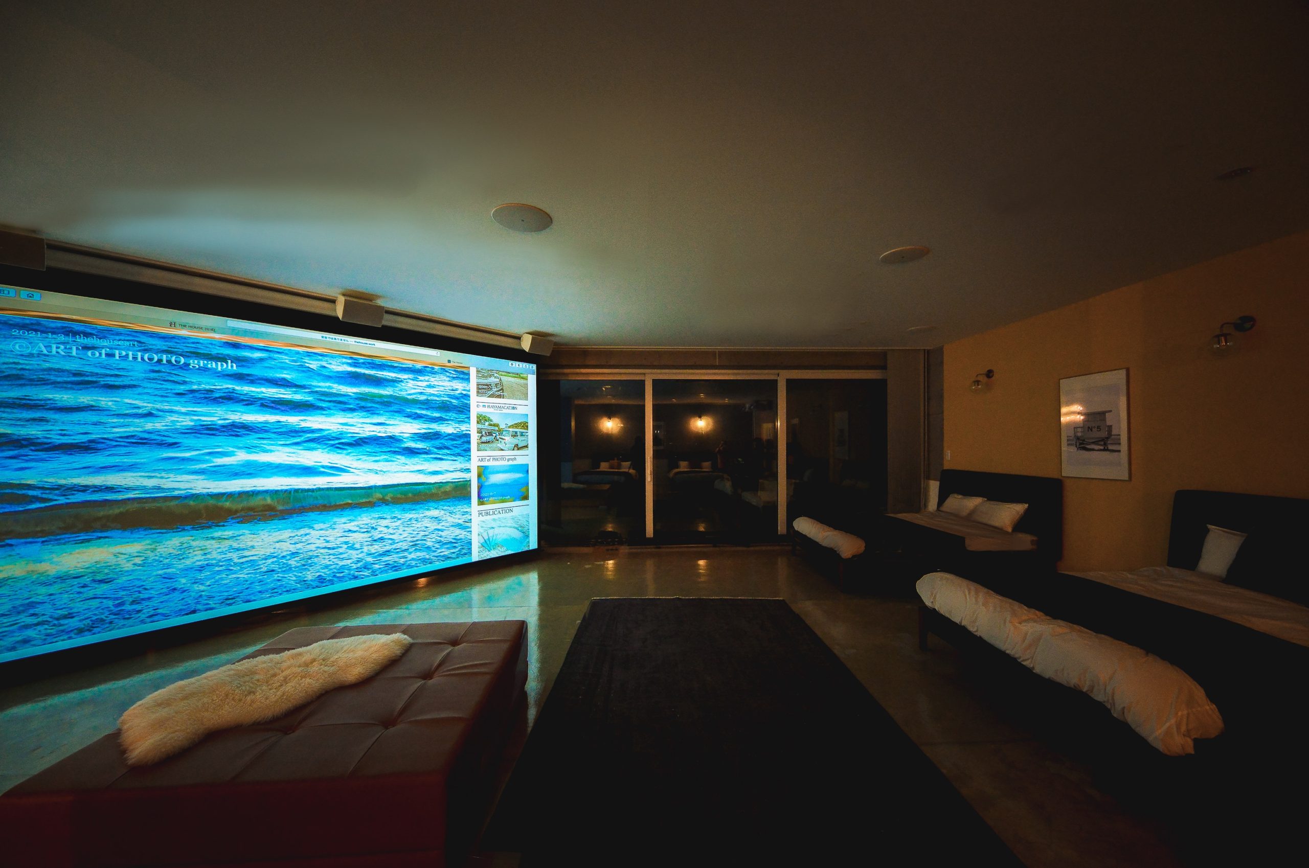 三浦市 三浦半島の小網代のプライベートレンタル邸宅”THE HOUSE 小網代マリーナスイート”のPool and Cave suiteの客室内にほぼ映画館並みのスケールの『すごい!海辺のシアター』登場!